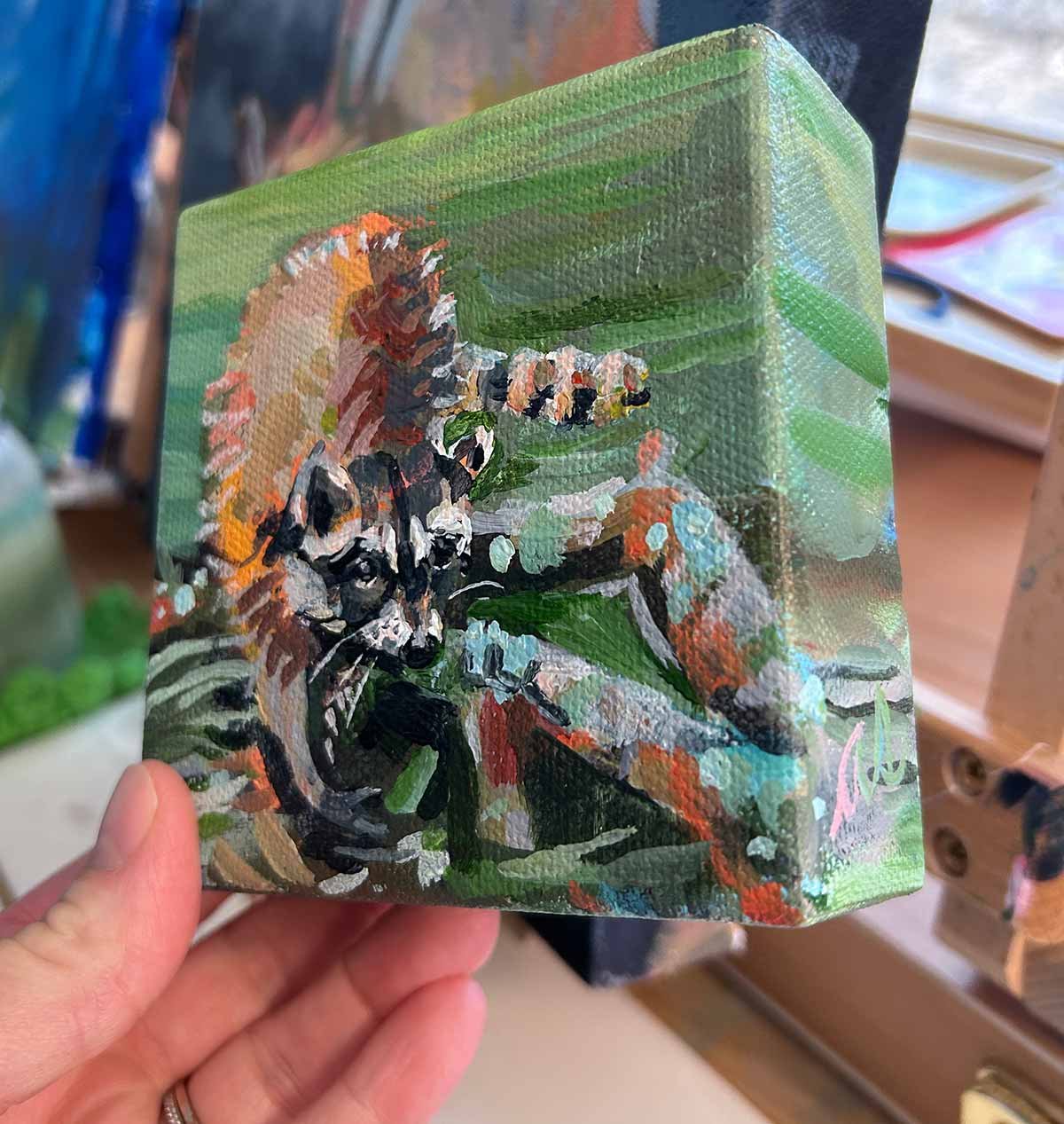 Original raccoon portrait, painted in an expressive abstract style.