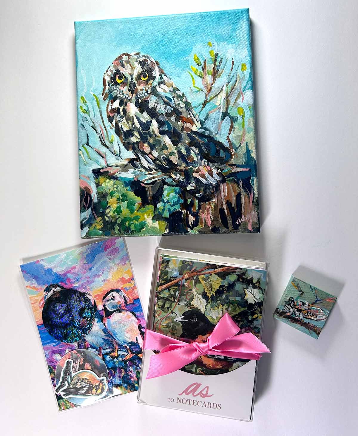 • 8x10" saw whet owl painting • a 12 pack of notecards • Puffin Hill mini print • Three stickers • 2x2" cicada painting