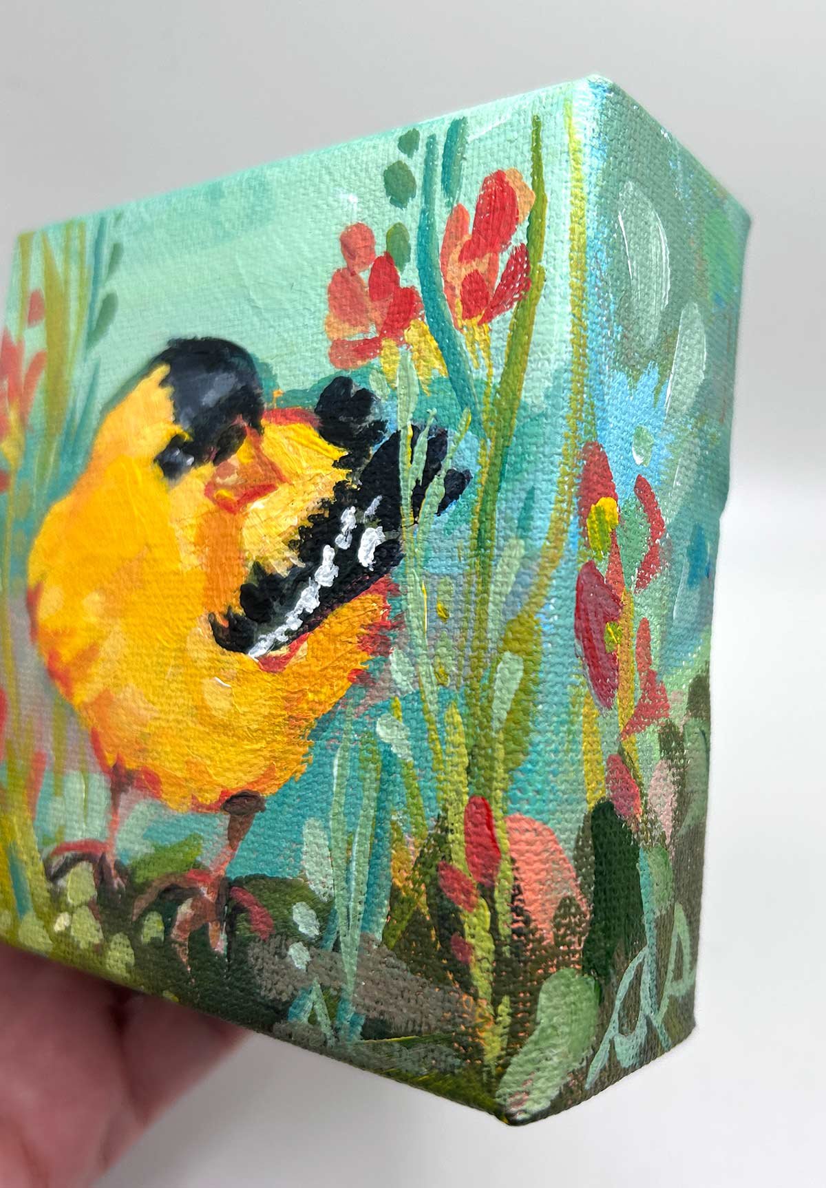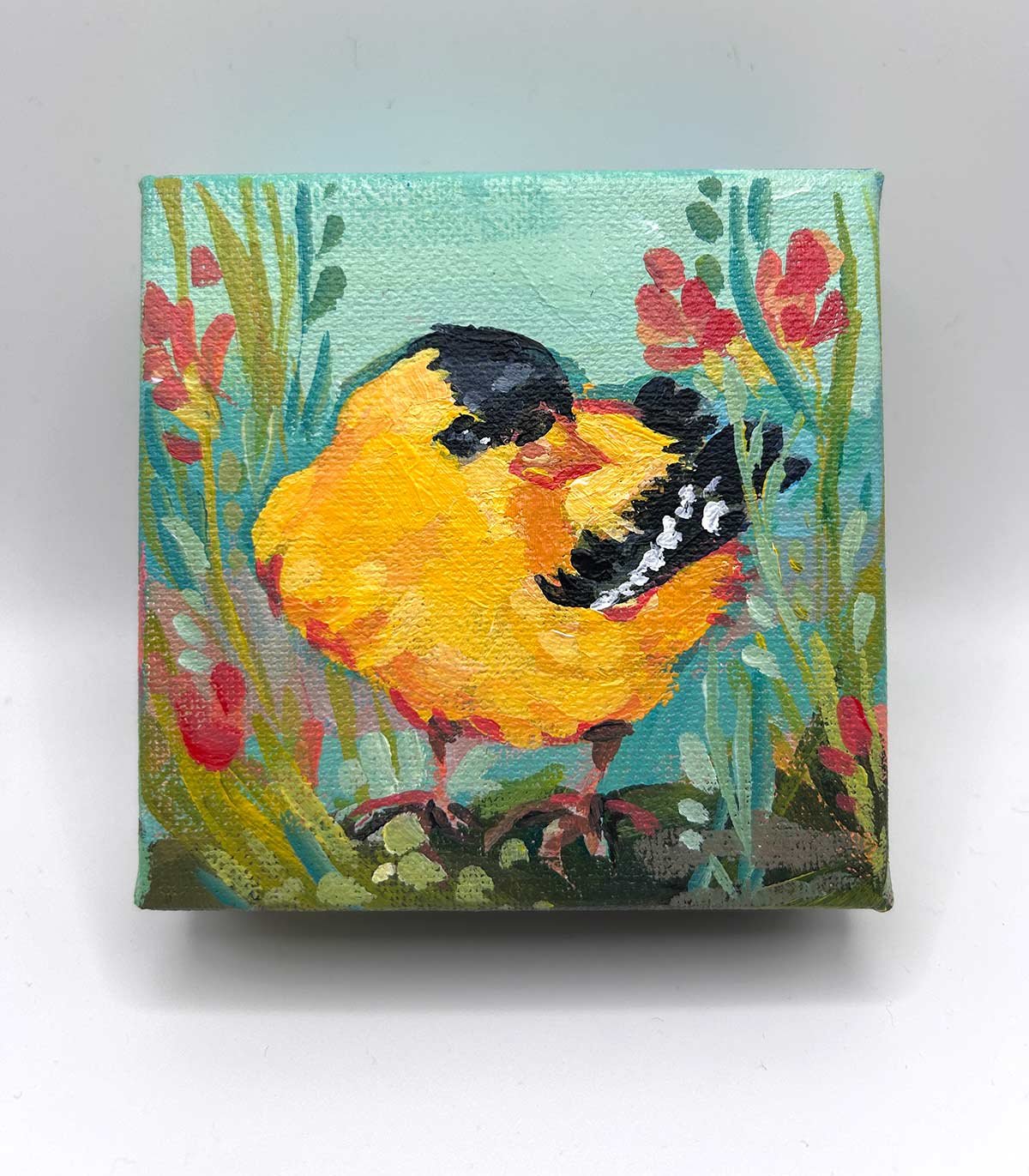 Original goldfinch portrait, painted in an expressive abstract style.